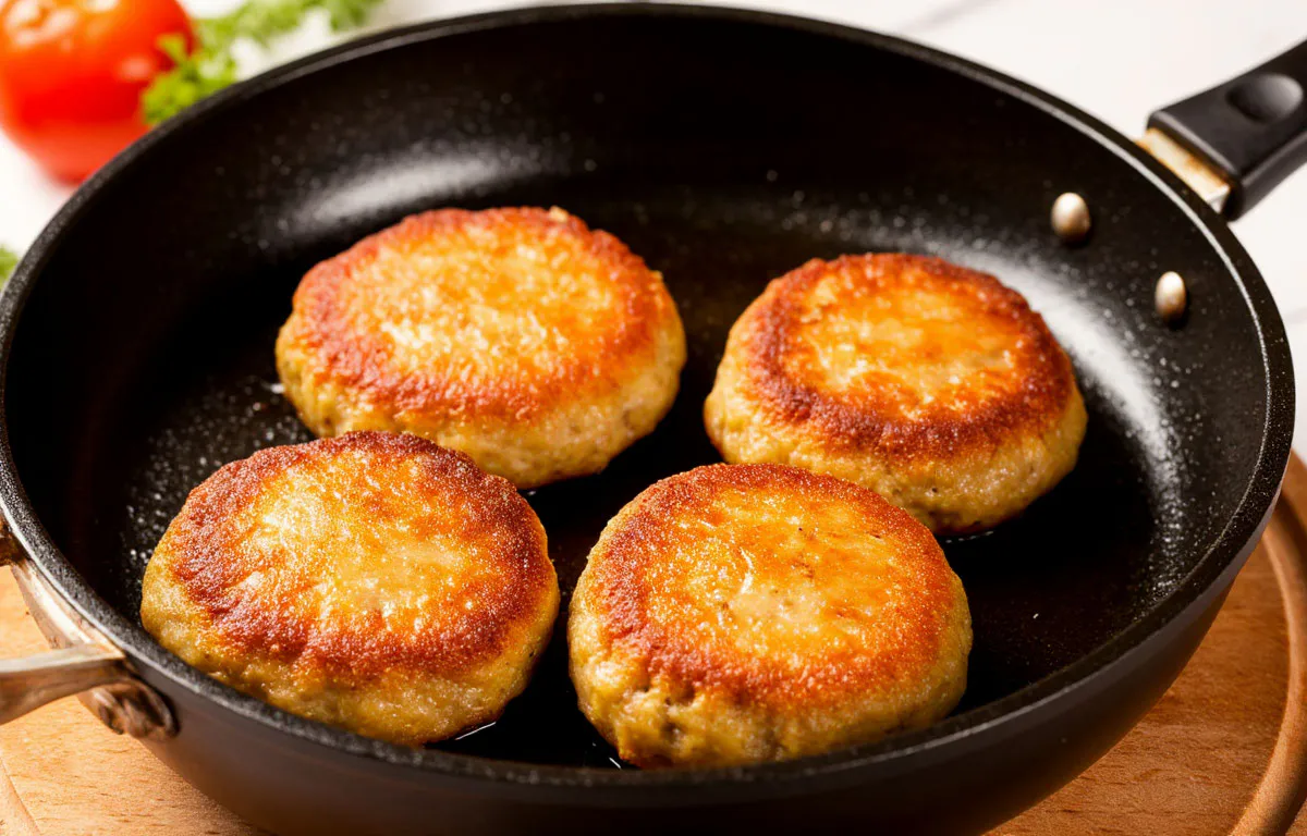 Нагрейте растительный жир на сковороде и начинайте лепить котлеты. Возьмите приблизительно столовую ложку массы, разместите на ладони, со всех сторон покройте панировочной крошкой и придайте желаемую конфигурацию.