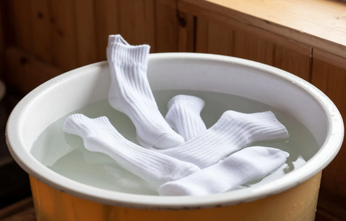 Носки помещаются в полученную смесь на тридцать минут. Соль способствует извлечению загрязнений из волокон, отбеливающие компоненты восстанавливают первоначальный цвет, а порошок нейтрализует неприятные запахи. Механизм действия отличается простотой и эффективностью.