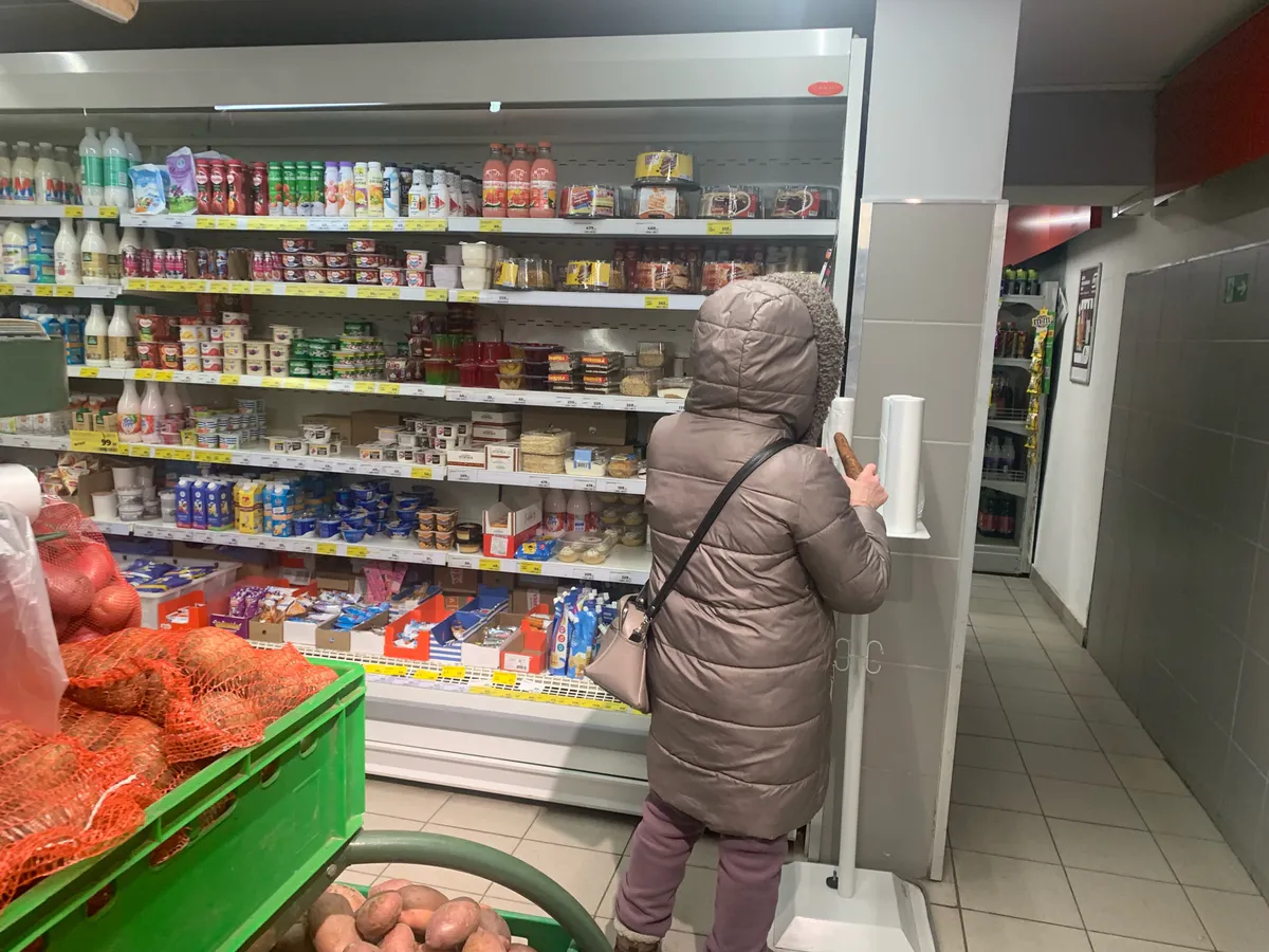 Автор обратил внимание на девушек, выбирающих овощные закуски и салаты в запаянных контейнерах. Запакованный продукт провоцирует желание проверить товар, заставляя некоторых покупателей нарушать правила. Продавцы и охрана стараются следить за порядком, но контроль не всегда эффективен.