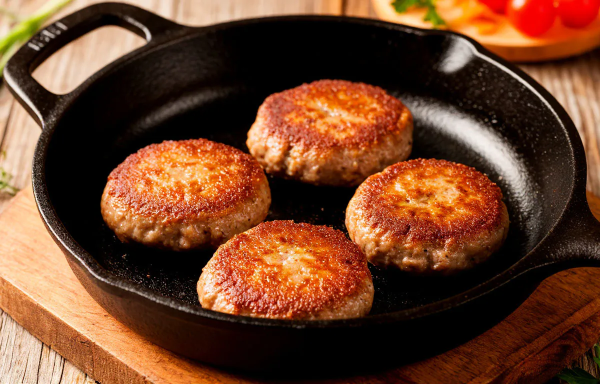 - Из охлажденного фарша формируют котлеты, обваливают их в муке или панировочных сухарях и обжаривают с двух сторон под крышкой до золотистой корочки.