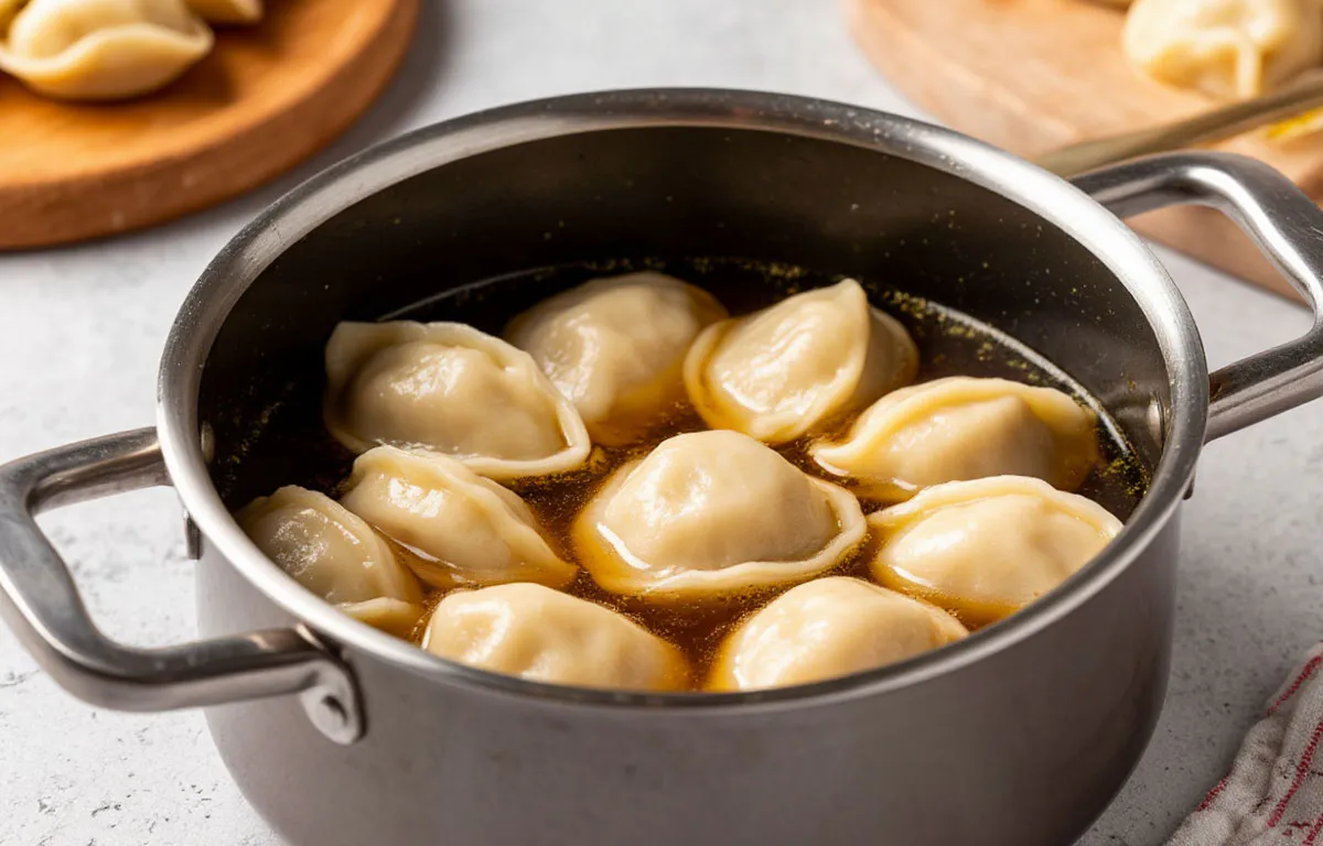 Подобная основа кардинально изменит органолептические свойства блюда. При отсутствии готового отвара допустимо применение бульонного концентрата без искусственных добавок. Ароматная жидкость насытит оболочку и фарш. Внутреннее содержимое приобретет повышенную сочность.