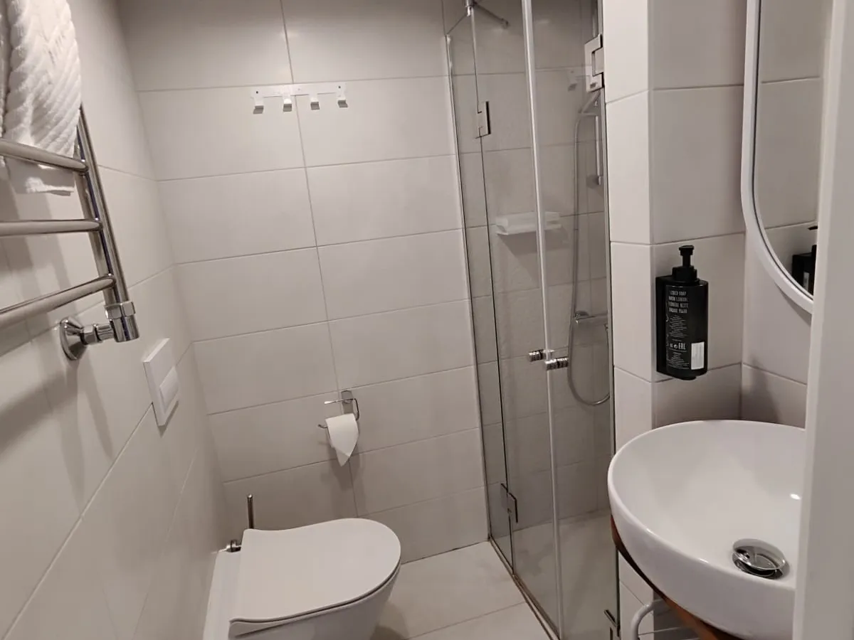 Выбор черной сантехники казался самым современным и стильным решением. Безусловно, выглядит она эффектно, но чрезвычайно требовательна в уходе. На ней моментально заметна любая пыль, отпечатки пальцев и следы от воды. Дополнительная проблема возникла с душевыми лейками. В месте крепления гигиенического душа к стене краска облезла, обнажив красноватый металл, вероятно латунь, из которой изготовлена лейка. Лейка в душевой кабине используется реже из-за наличия верхнего душа, но и на ней уже появились небольшие сколы краски.
