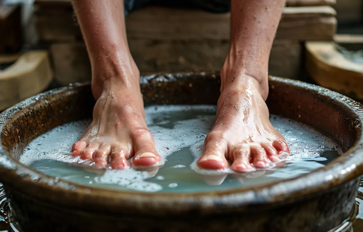 - Наденьте хлопчатобумажные носки на сухие ноги и опустите стопы в тазик с раствором, чтобы носки хорошо пропитались.