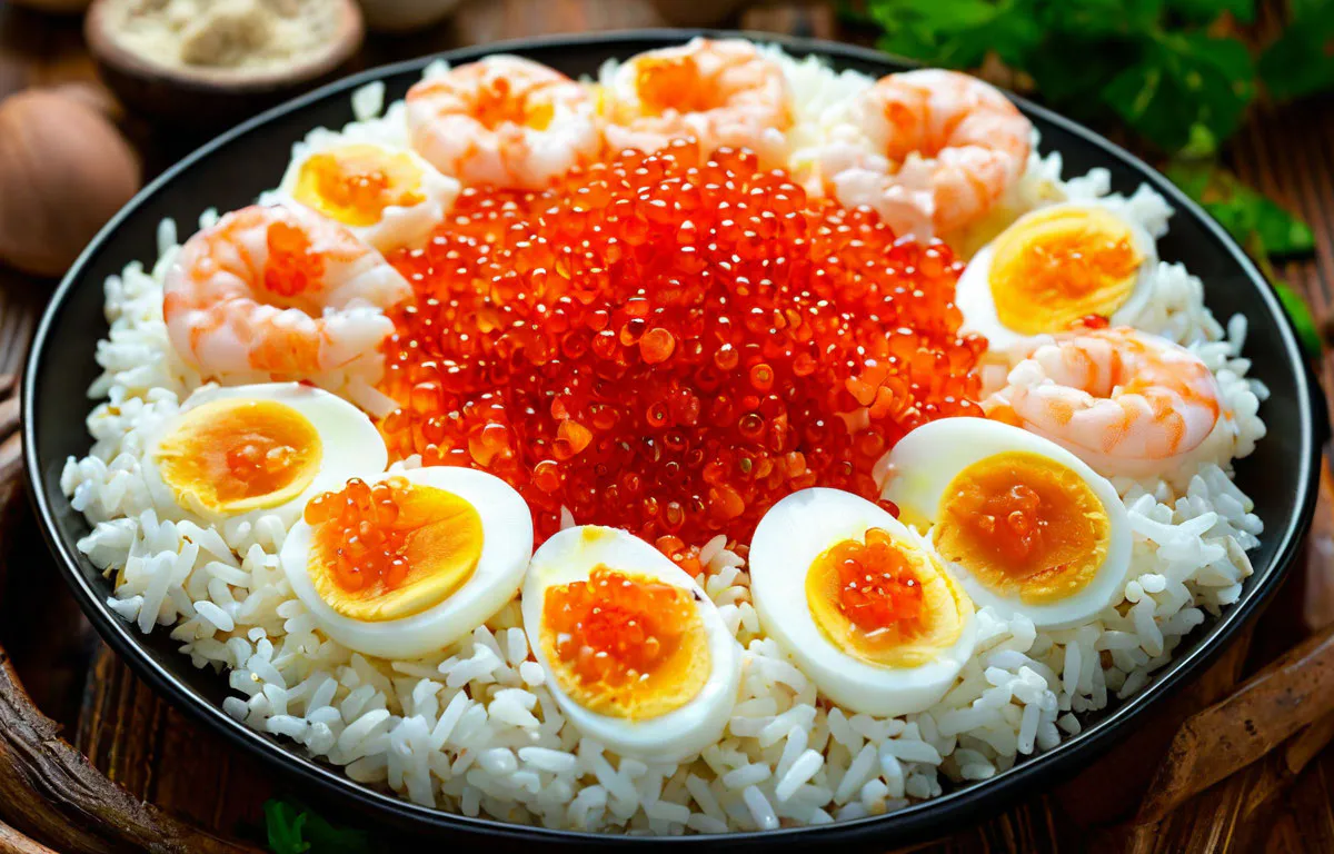 Рецепт салата «Снежинка» с рисом и креветками