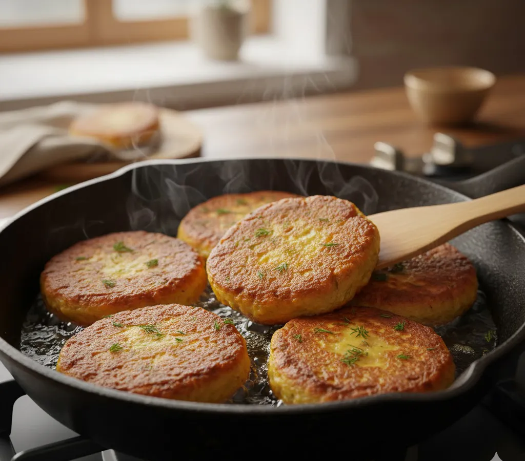 - Обжаривание: Хорошо прогрейте сковороду на среднем огне. Налейте достаточно растительного масла, чтобы оно образовало тонкий, но сплошной слой на дне. Столовой ложкой аккуратно выкладывайте тесто, формируя круглые оладушки желаемого размера.